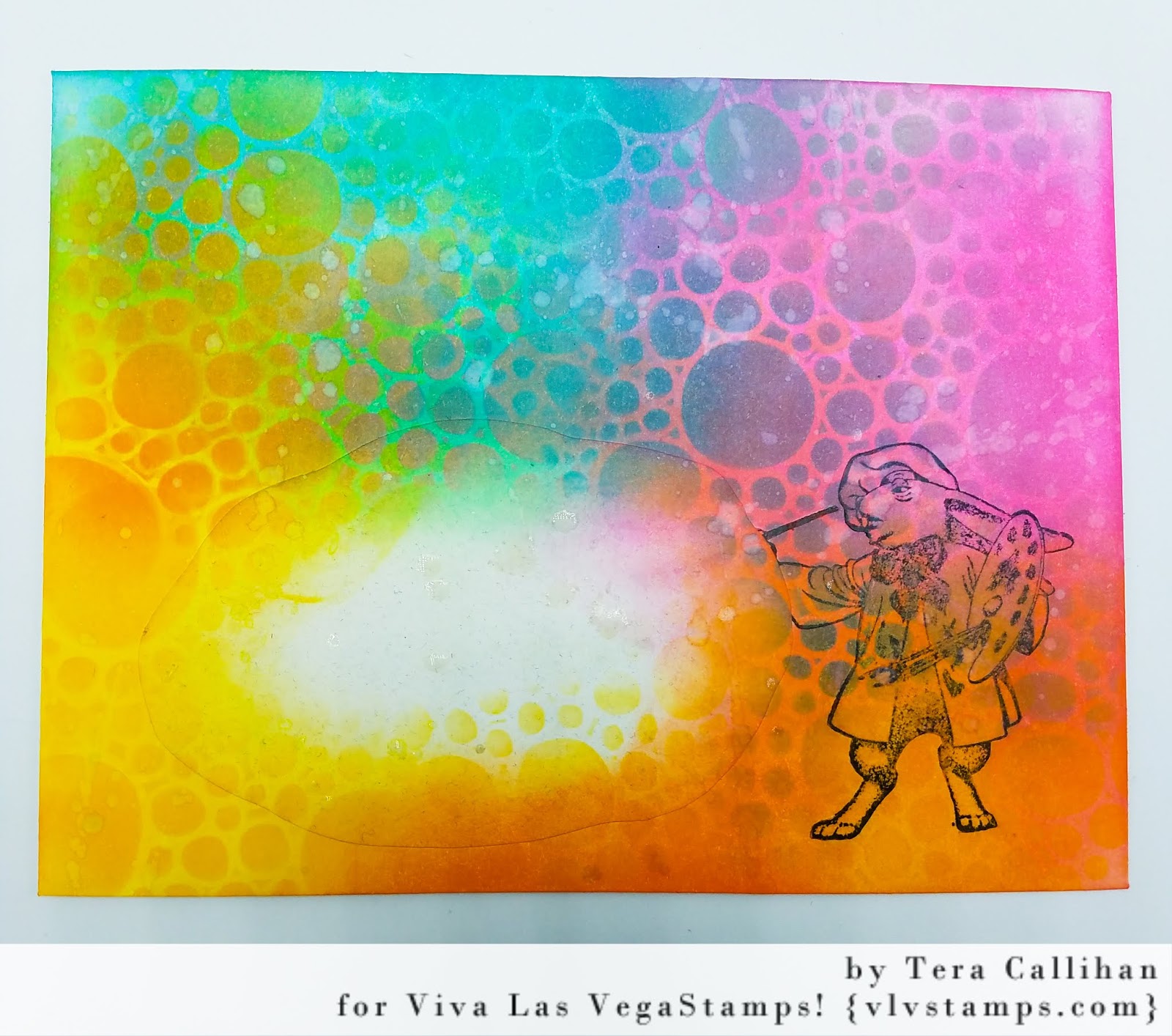 Beginning with an A2 envelope, I stamped the bunny in black memento ink, then masked him off. Next I cut a blob shap out of scrap paper to make the mask for the address box.